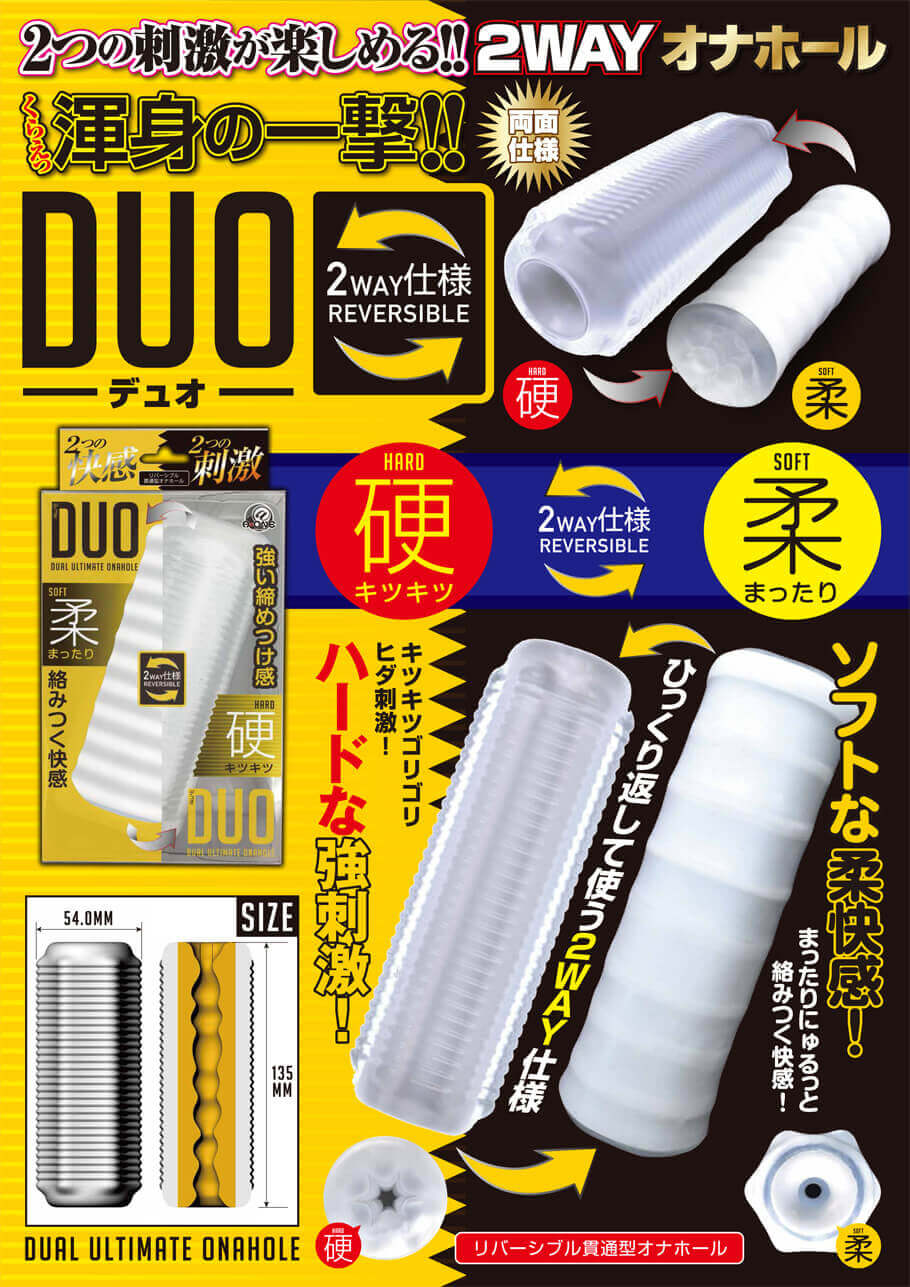 貫通型は洗いやすくメンテナンスがしやすいところが利点。反対側をつまんだりふさいでバキュームを作ってもよいですし、貫通型の利点を活かして亀頭を刺激してもいいですね。ディープスロートローターなどのマイクロローター系アイテムと組み合わせるのもアリ!ハードな圧迫感や締め付けがお好みの方はぜひ1度DUO(デュオ)をお試しくださいませ!!